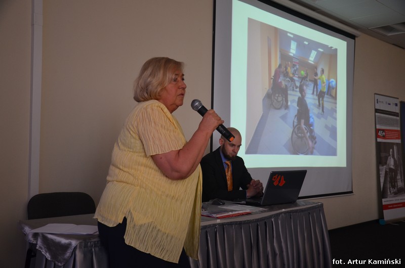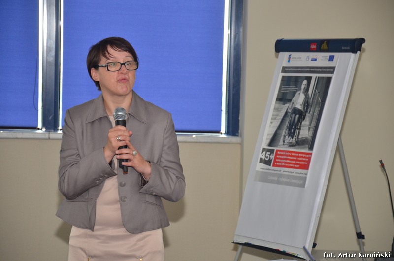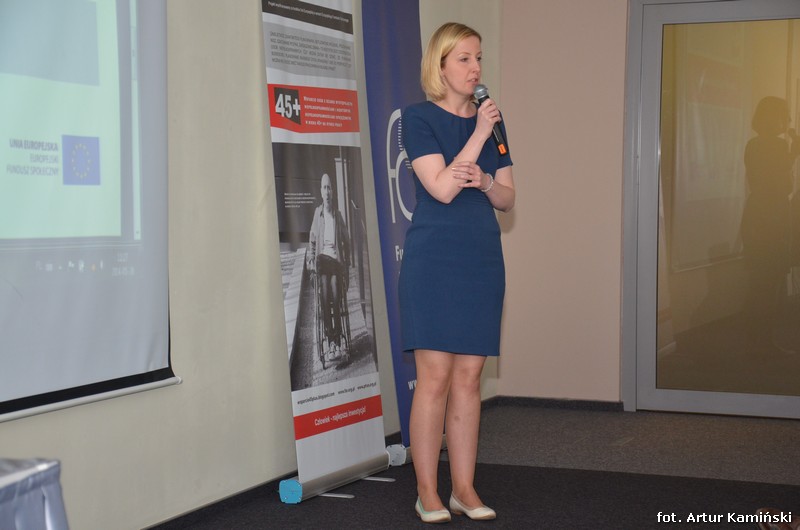 Następnie głos zabrała pani Anita Klimek-Jezierska, specjalista ds. HR w Polskiej Akademii Rozwoju Przedsiębiorczości, z prezentacją „Zatrudnianie osób niepełnosprawnych w tym w wieku 45+ w administracji rządowej”. W prezentacji zostały poruszone kwestie związane z problemami, barierami i wszelkimi utrudnieniami związanymi z zatrudnieniem osób niepełnosprawnych w administracji publicznej, zarówno po stronie pracodawcy (np. silna konkurencja, limity etatowe) jak i osób niepełnosprawnych (np. niska samoocena). Prelegentka zauważyła jednocześnie, opierając się na danych Biura Pełnomocnika Rządu ds. Osób Niepełnosprawnych [ 2 ], że wiele osób niepełnosprawnych uważa, że nie ma ograniczonej zdolności do wykonywania pracy. Prezentacja zakończyła się konkluzją, że zatrudniając osobę niepełnosprawną powinno zatrudniać się ją w kategoriach jej kompetencji i doświadczenia (zatrudnianie na konkretne stanowisko) a nie w kategoriach niepełnosprawności.
