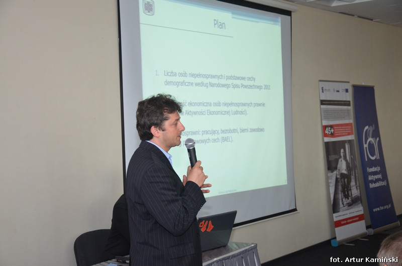 Ostatnia prezentacja przed przerwą, „Osoby niepełnosprawne, w tym w wieku 45 lat i więcej, na rynku pracy według badań statystyki publicznej” prowadzona była przez przedstawiciela Głównego Urzędu Statystycznego, pana Radosława Antczaka, konsultanta w Departamencie Badań Demograficznych i Rynku Pracy przy wsparciu merytorycznym pani Iwony Biały, naczelnika wydziału w GUS. Zaprezentowane zostały szczegółowe dane dotyczące obecności osób niepełnosprawnych na rynku pracy, pochodzące ze spisu powszechnego przeprowadzonego w 2011 roku.